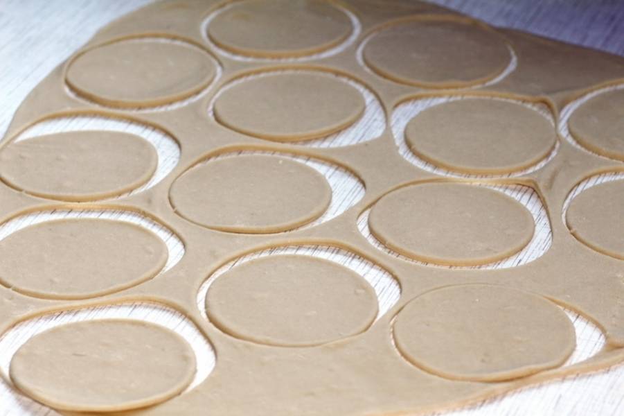 Готовое тесто раскатываем в тонкий пласт и вырезаем из него кружочки при помощи стакана.