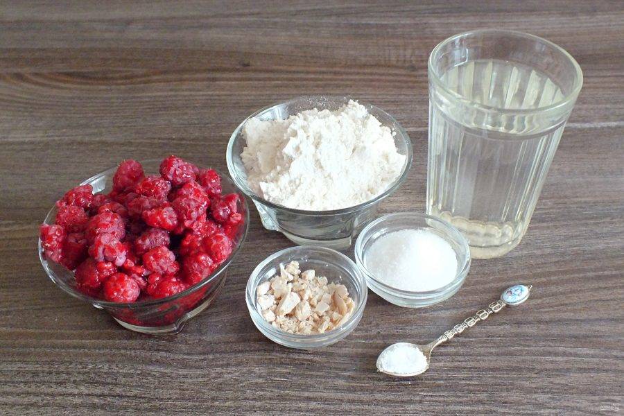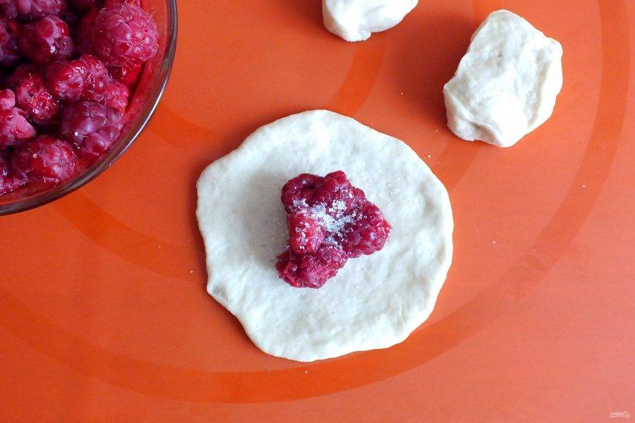 Каждый кусочек раскатайте в лепешечку. На середины выложите по 1/2 ст.л. малины. Если необходимо, присыпьте щепоткой сахара.