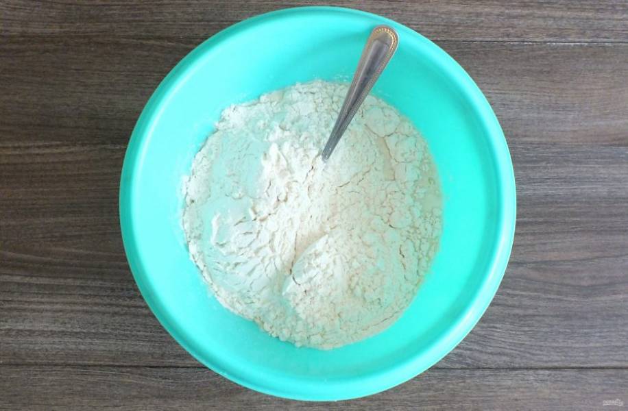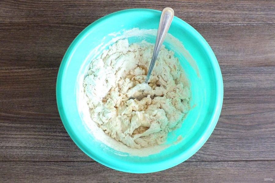 По истечении времени всыпьте муку и начните перемешивать ложкой.