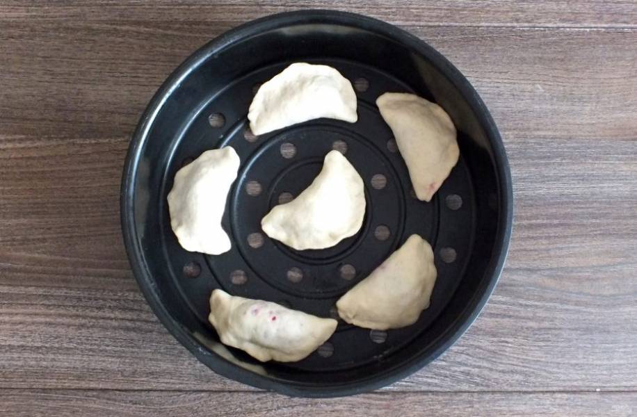 Разогрейте пароварку. Чашу пароварки смажьте тонким слоем растительного масла. Выложите вареники на расстоянии друг от друга. Поставьте в пароварку. Варите 10 минут.