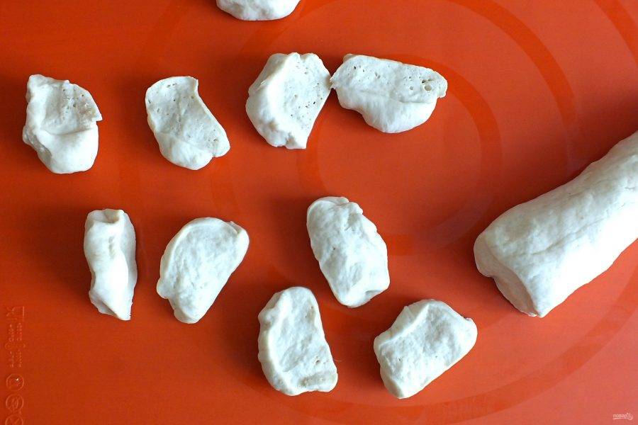 Разделите тесто на две части. Скатайте из каждой части жгут. Нарежьте жгут на кусочки в пределах 4-5 см.