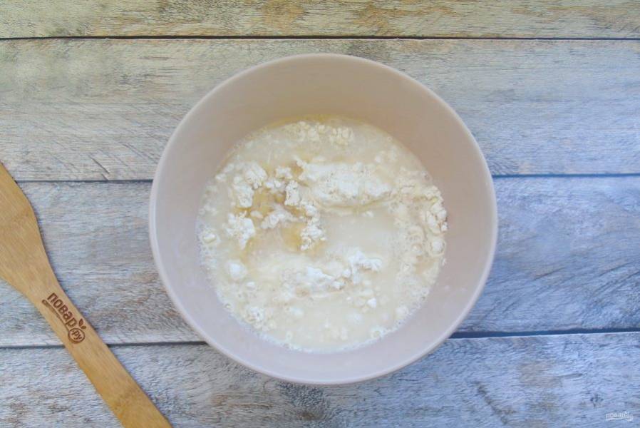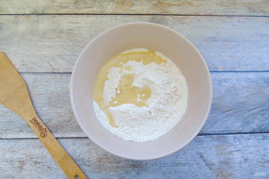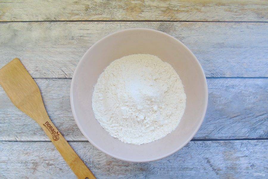 Приготовьте тесто. В миску насыпьте муку и соль.