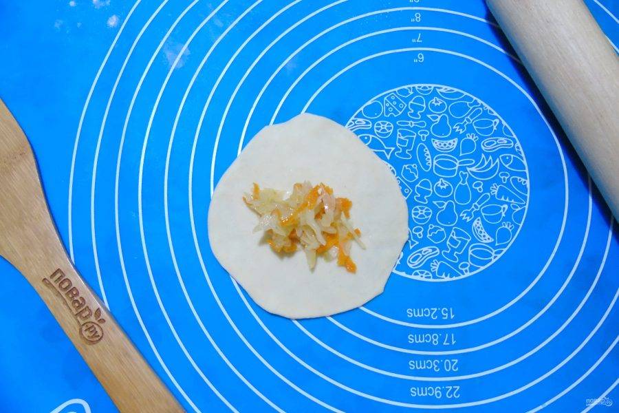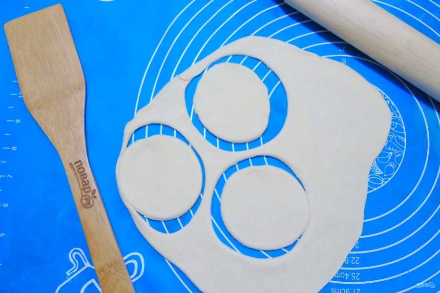 От теста отрежьте кусок и раскатайте в тонкий пласт. Вырежьте кружки.