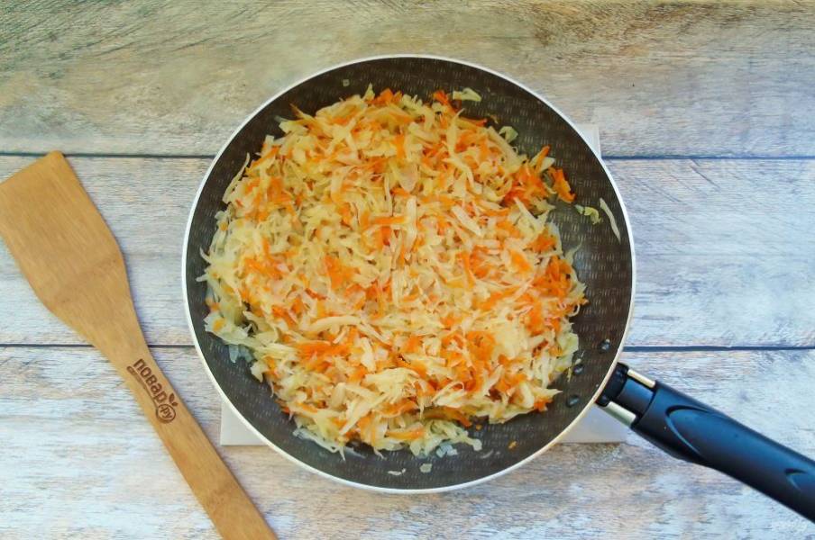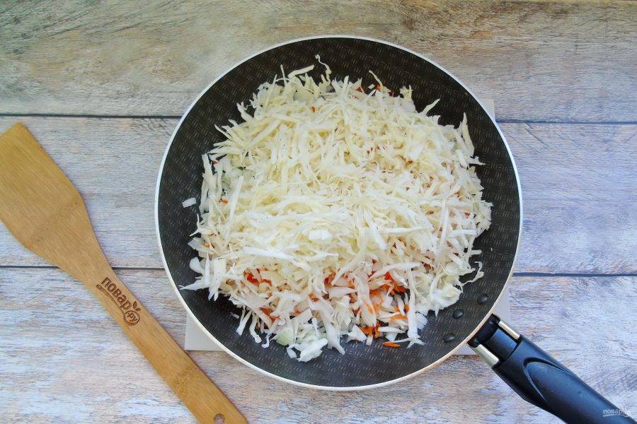 Капусту мелко нарежьте и добавьте к луку и моркови.