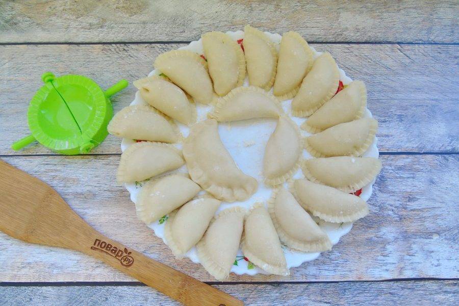 Тарелку или разделочную доску посыпьте мукой и выложите вареники. Я их лепила с помощью простого приспособления, но и обычным способом получается очень хорошо.