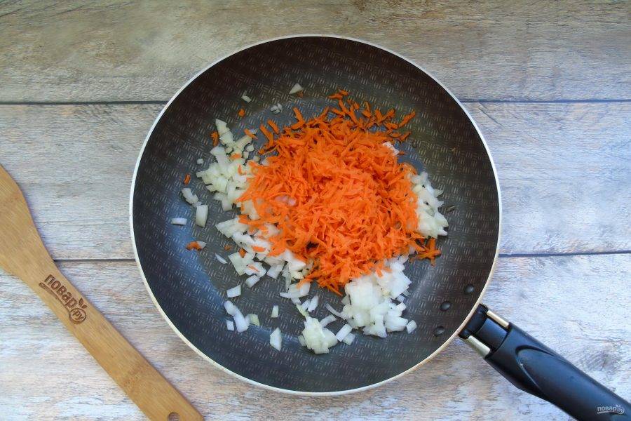 Приготовьте начинку. Лук и морковь очистите, помойте. Лук мелко нарежьте, а морковь натрите на терке. Выложите в сковороду.