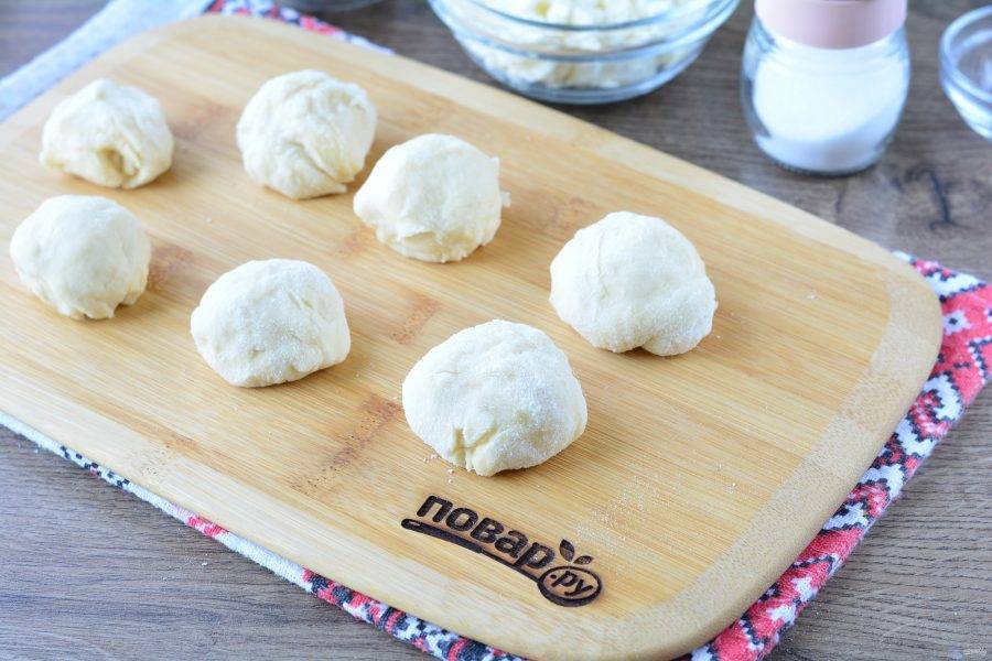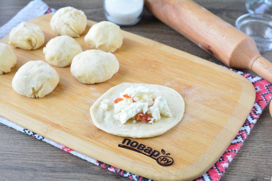 Каждый шарик раскатайте, выложите чайную ложку начинки.