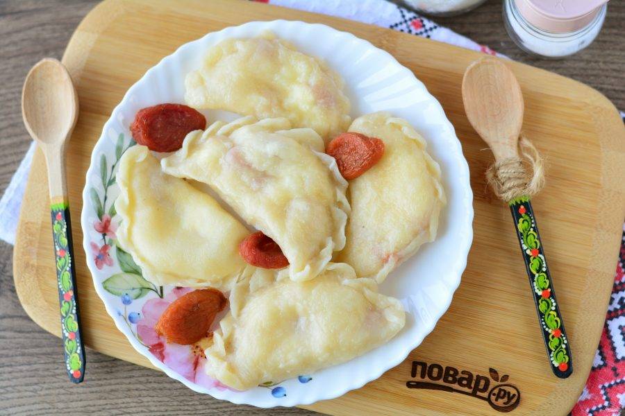 Из муки, яиц, воды и растительного масла замесите мягкое тесто. Для начинки смешайте творог и кусочки кураги. Отваривайте в большом количестве кипящей воды.