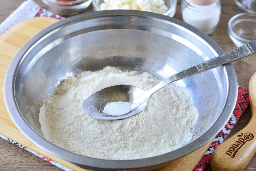 Просейте муку в глубокую миску, перемешайте с одной щепоткой соли.
