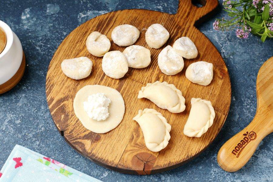 Каждый кусочек обваляйте с двух сторон в муке и раскатайте в форме круга. По центру выложите начинку и соедините края любым удобным способом.