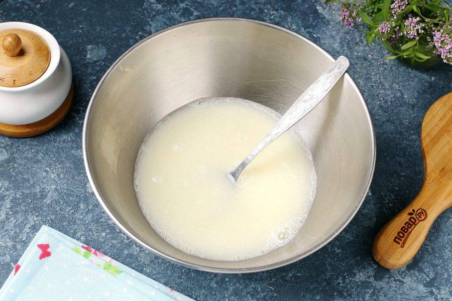 В глубокой миске взбейте яйцо, добавьте тёплую воду и соль. Вода должна быть ощутимо тёплой, так тесто замесится быстрее.