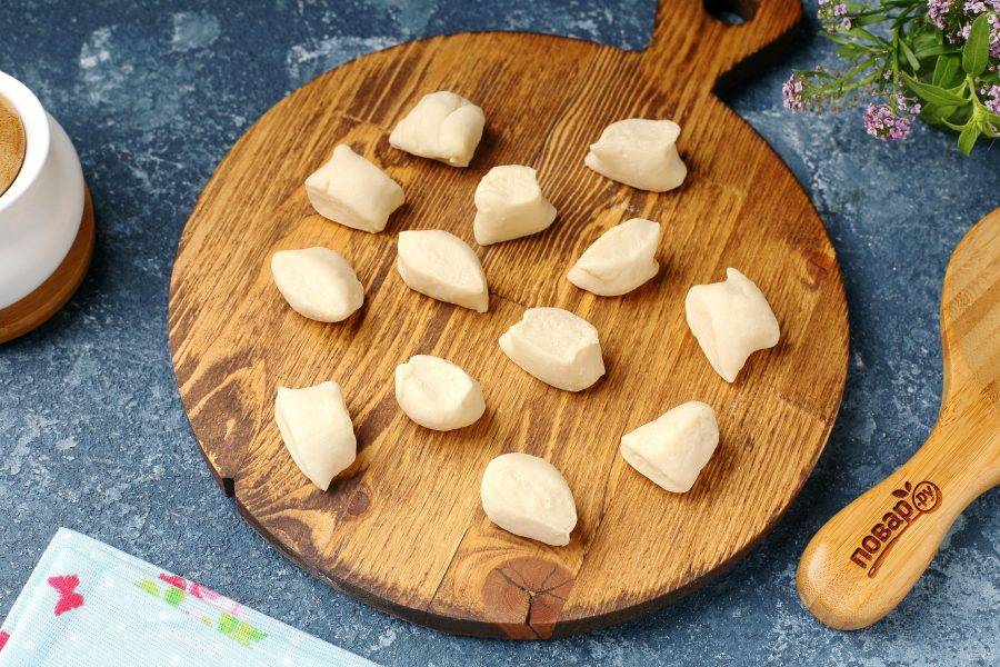Затем разделите тесто на 3 части. Две оставьте под полотенцем, а третью раскатайте в длинную колбаску и нарежьте её на кусочки.