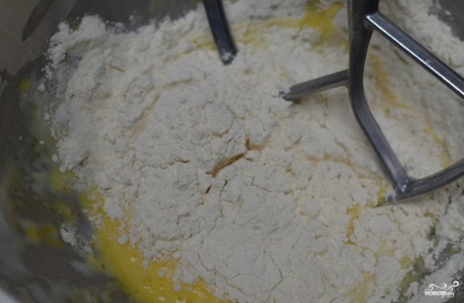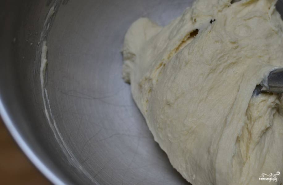 Затем добавим воду и молоко, должна образоваться однородная масса в которую мы добавляем еще 3 стакана муки. Все хорошенько вымешиваем.