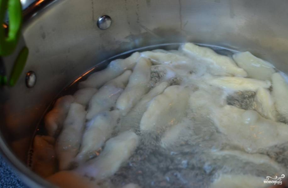 Однако чем свежей вареники, тем они вкусней, поэтому я предпочитаю их варить сразу. Для этого на печку ставим воду, доводим ее до кипения, затем опускаем в нее вареники и варим около 7 минут, пока они не всплывут. Не забывайте иногда их перемешивать.