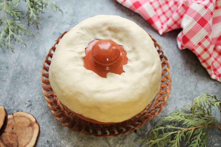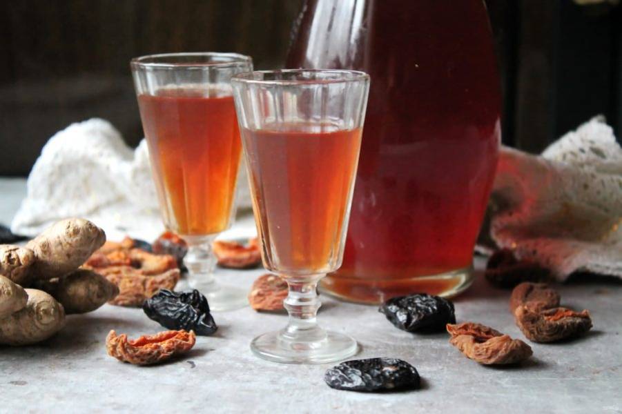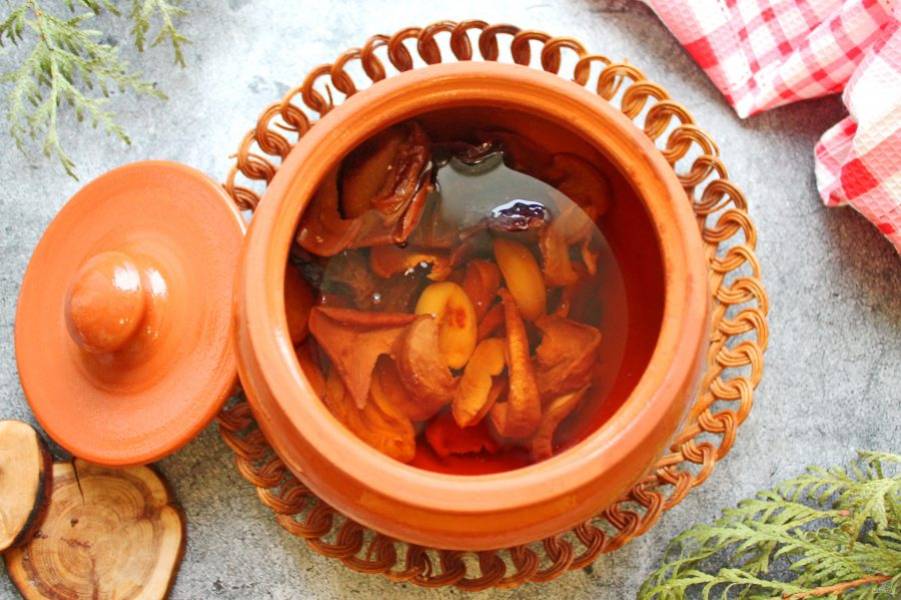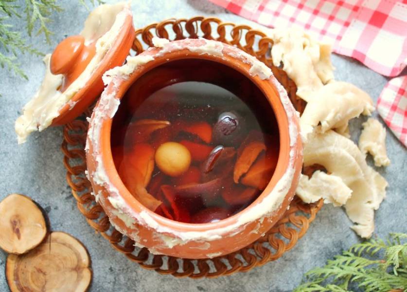 В глиняный горшок выложите сухофрукты, влейте водку и плотно закройте горшочек крышкой. Если она прилегает не плотно, положите на горлышко пленку, закрепите и прижмите крышкой. Оставьте в теплом месте на 8 часов.