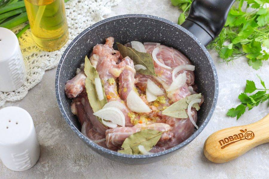 Нарежьте полукольцами очищенный и промытый репчатый лук. Всыпьте нарезку вместе с лавровыми листьями и приправой в емкость. По желанию вы можете добавить и другие приправы и специи.