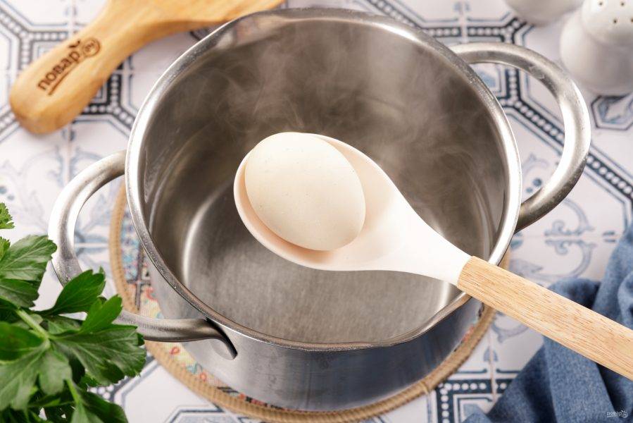 Вскипятите воду в кастрюле. Воду посолите – 2 столовые ложки на литр. Даже если яйцо треснет, белок не вытечет. Осторожно опустите яйцо в кипящую воду. Нельзя класть холодные яйца в кипяток. Нагрейте их до комнатной температуры, предварительно выложив их из холодильника на час. Или подогревайте в тёплой воде. Варите на максимальном огне без крышки.
