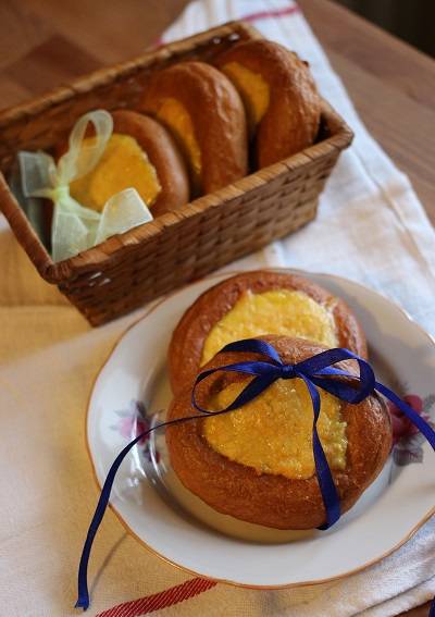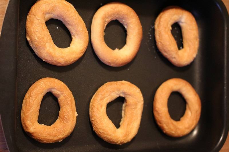 5. В каждую баранку выложить по столовой ложки начинки. Выпекать в разогретой до 180С духовке примерно 15 минут до золотистого цвета начинки.