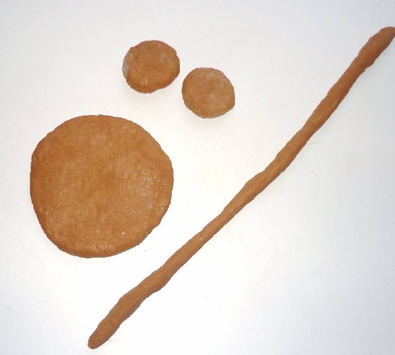Для оформления одной ватрушки в виде Микки Мауса понадобится: одна большая часть теста,одна поменьше и две маленькие части теста. Из большей части теста сформировать лепешку,из части теста,которая поменьше сформировать длинный жгут,две маленькие теста скатать в шарики и немного прижать.