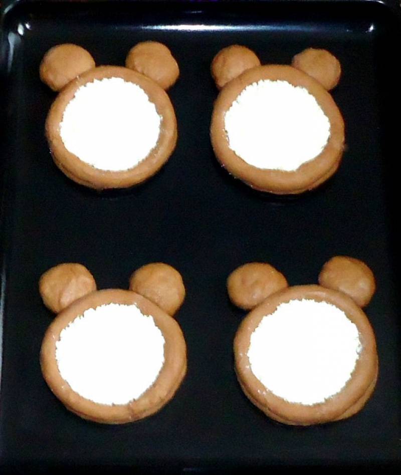 Противень смазать растительным маслом,выложить заготовки из теста,к каждой приложить по 2 маленьких кусочка из теста - это будут "уши". Заполнить ватрушки начинкой и выпекать в духовке при температуре 180-190 градусов в течении 20-25 минут,в зависимости от духовки.