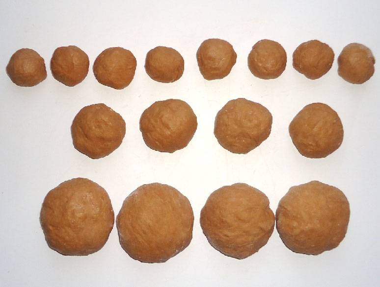 Подошедшее тесто разделить на 16 частей - 4 части большие,4 части поменьше и 8 маленьких частей.