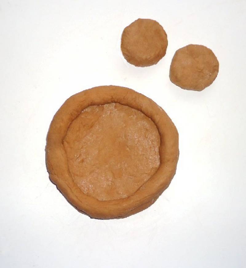 Жгут положить на лепешку из теста в виде ободка. Таким же образом сформировать ещё три ватрушки.