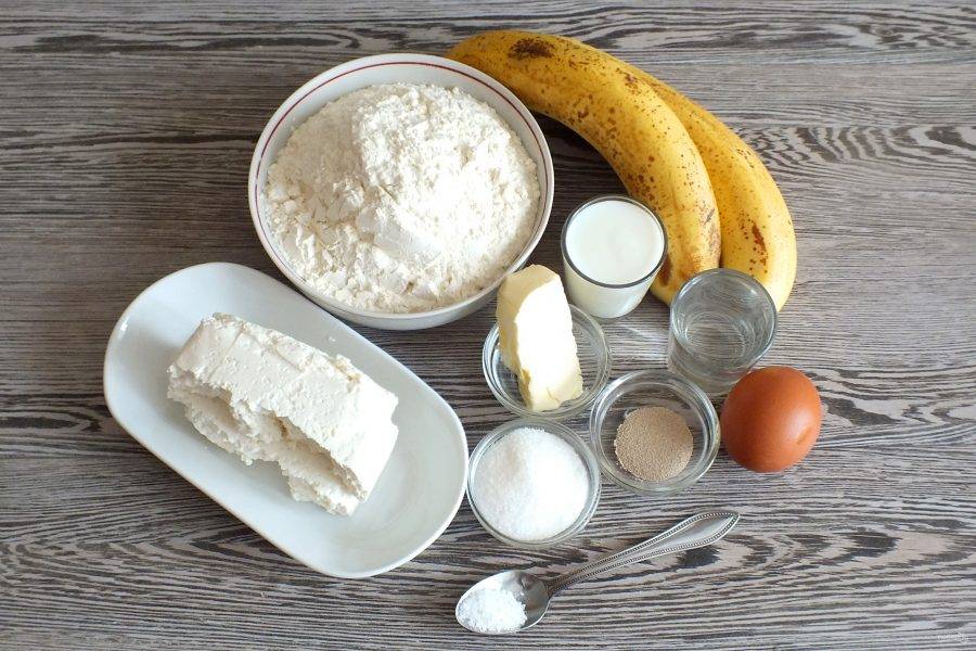 Пока расстаивается тесто, сделайте начинку. В чаше смешайте творог, 1 банан, 1 ст.л. сахара. Пробейте блендером до однородного состояния.