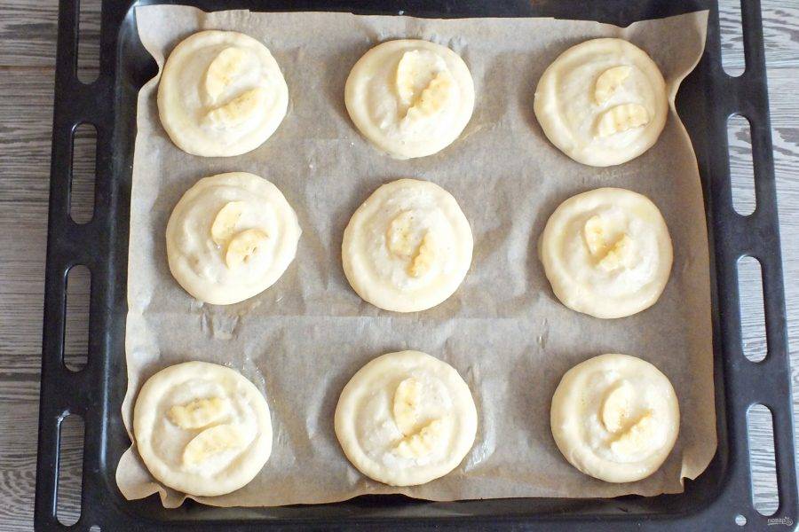 Нарежьте банан на кусочки и разложите их на ватрушки. Смажьте взбитым яйцом. Поставьте выпекаться в разогретую до 180 градусов духовку на 15-20 минут.