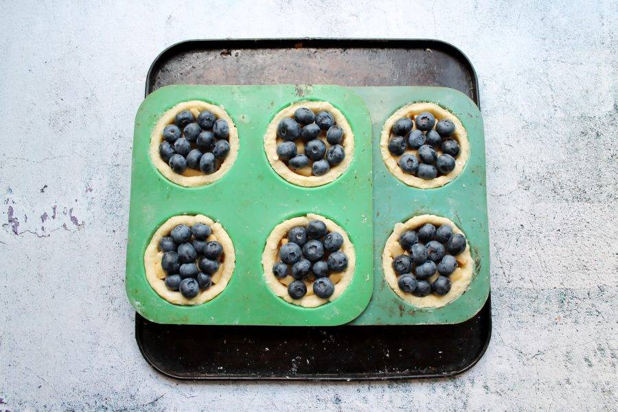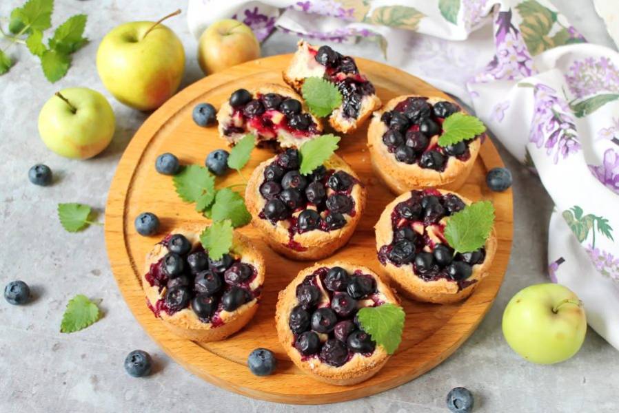 Поверх яблок разложите ягоды голубики. Поставьте ватрушки в горячую духовку и выпекайте при температуре 180 градусов в течение 20-25 минут. Достаньте формочки с ватрушками из духовки, остудите и подавайте.