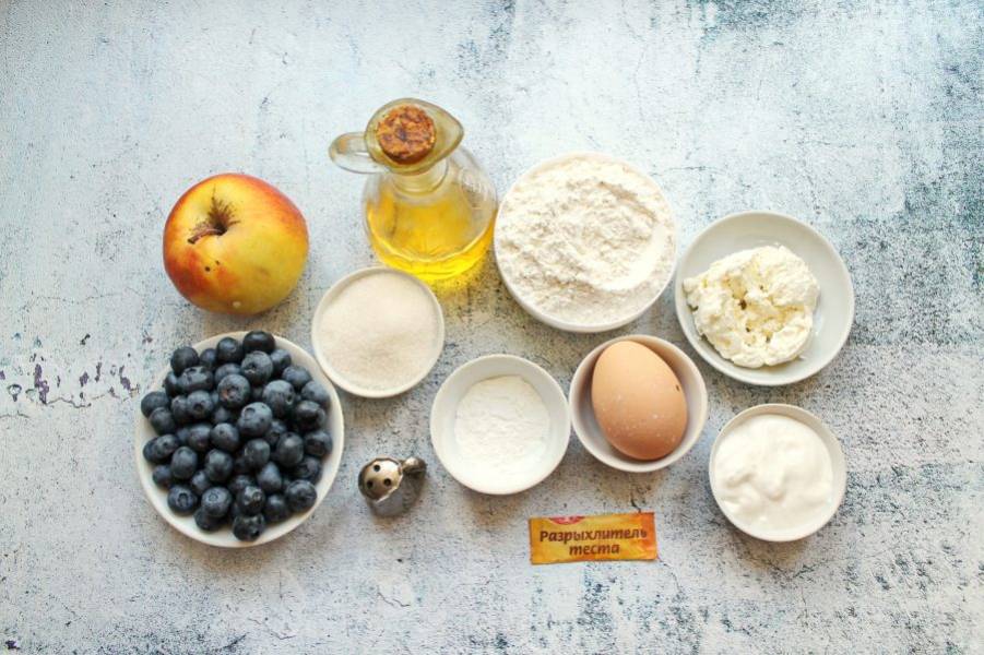 Подготовьте все необходимые ингредиенты для приготовления ватрушек с голубикой и яблоком. Яблоко и ягоды вымойте и обсушите.