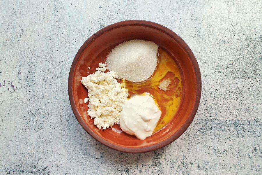 В миску выложите творог, сахар, соль, сметану и влейте половину размешанного яйца, перемешайте.
