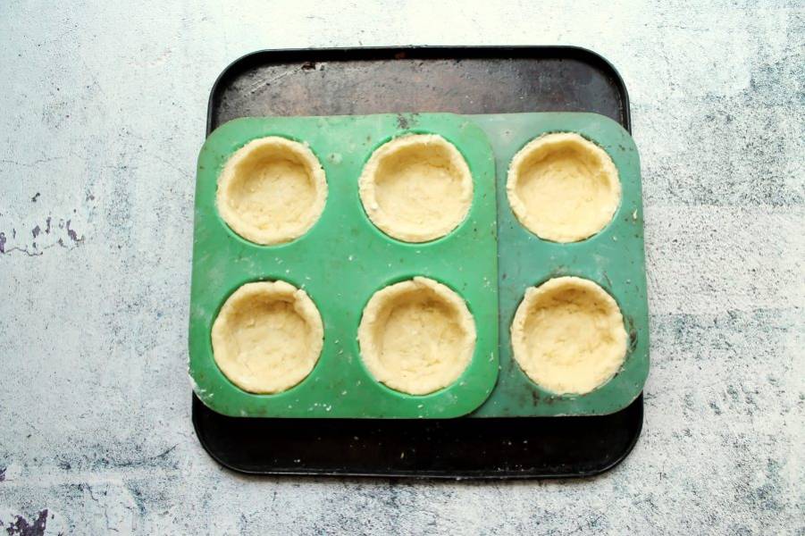 Формочки для выпечки смажьте растительным маслом, выложите по одному кусочку теста и распределите по дну и бокам. Наколите тесто на дне вилкой.