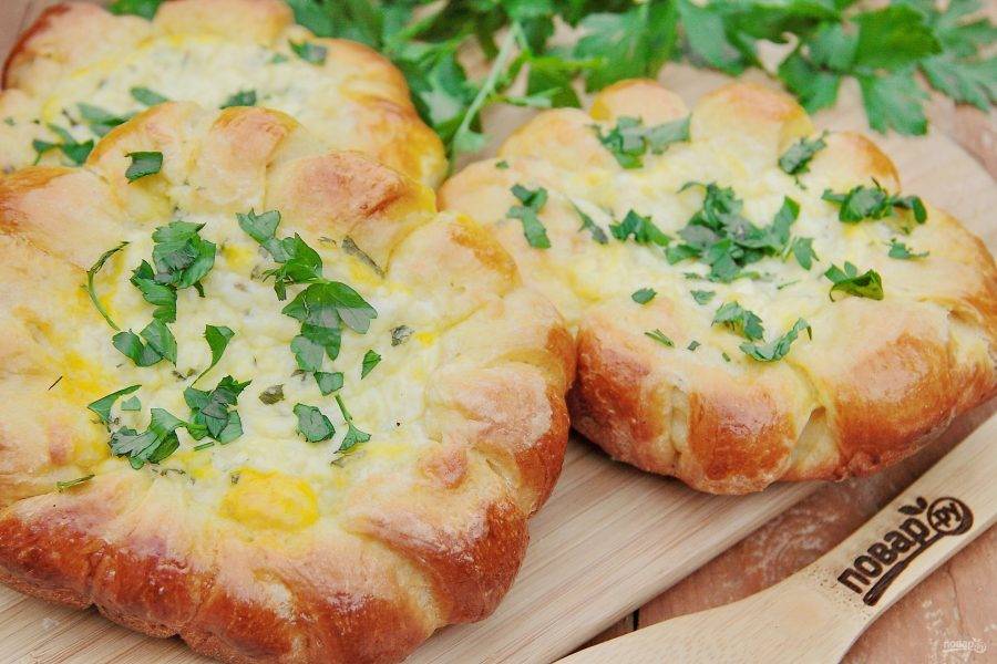 Выпекайте при 180 градусах около 25 минут. Ватрушки с творогом, брынзой и зеленью готовы.