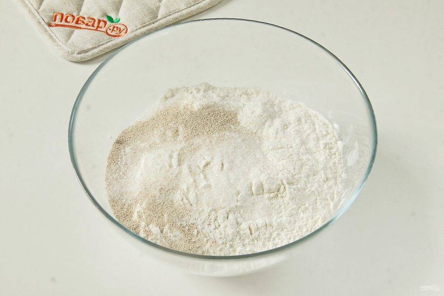 В глубокую миску просейте муку, добавьте сахар, дрожжи и 1/2 ч. л. соли.
