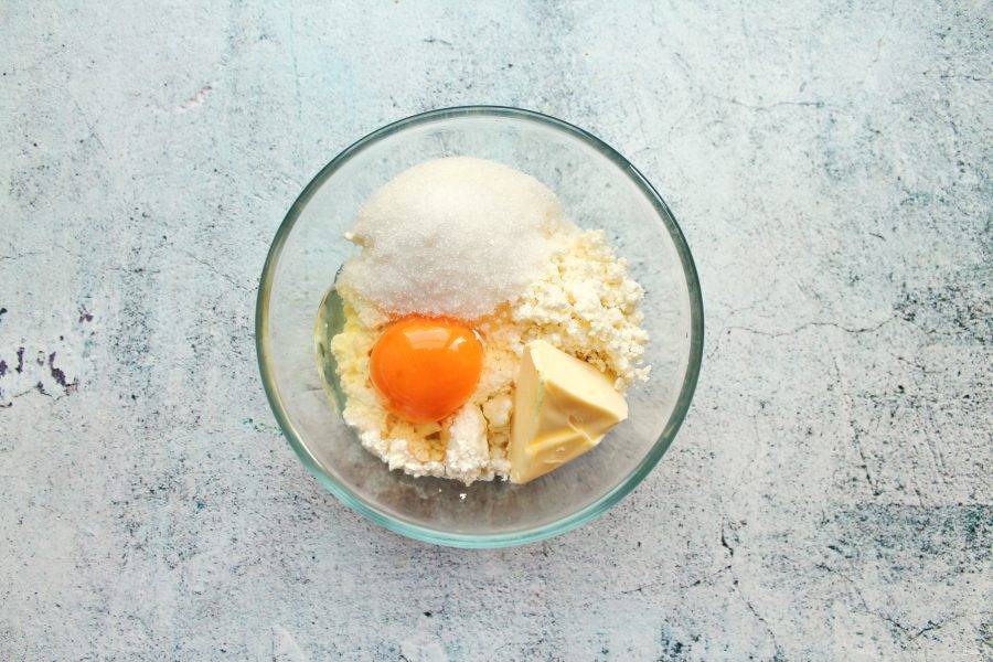 В миске смешайте творог, яйцо, мягкое сливочное масло и сахар.