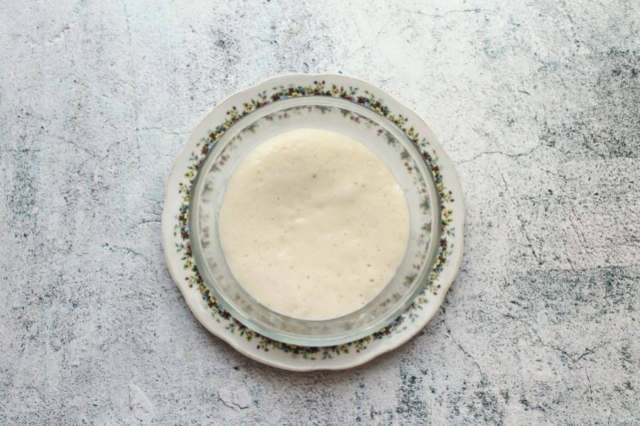 В 60 миллилитрах теплой воды разведите дрожжи и 100 грамм муки. Все перемешайте до однородности, накройте и оставьте в теплом месте на 2 часа при температуре 40 градусов, для подъема опары.