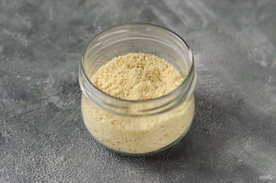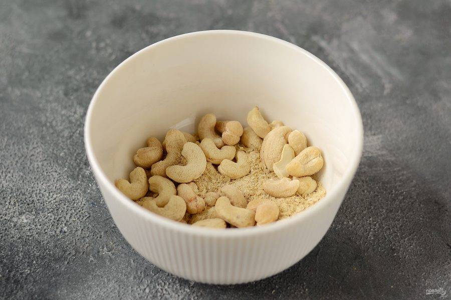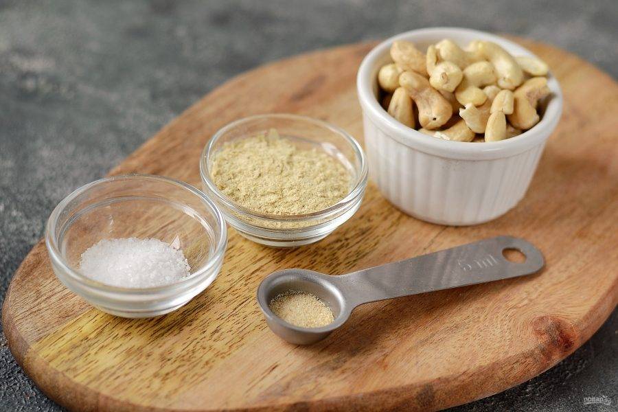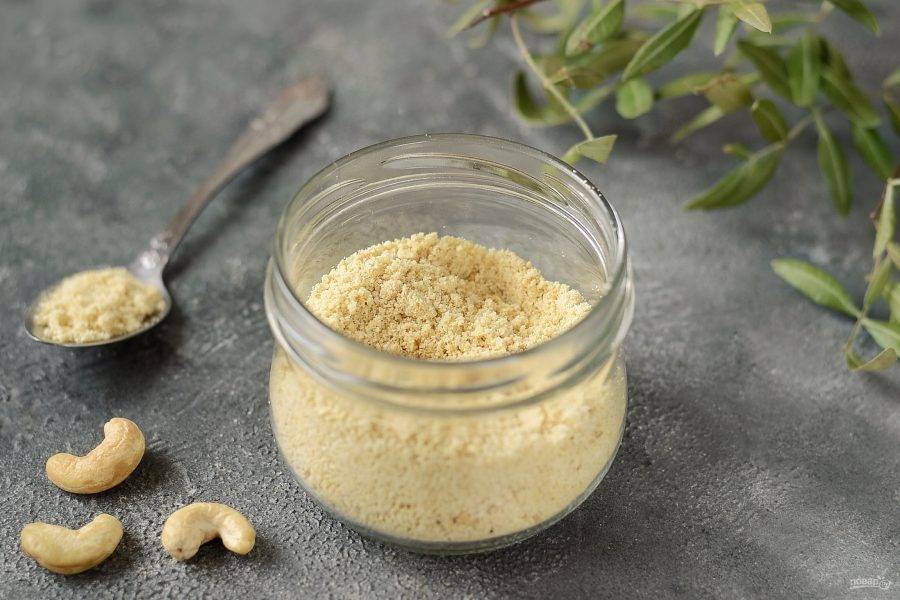 Веганский пармезан — это такая присыпка из орехов и пищевых дрожжей. Вкус получается ярким и насыщенным. Орехи придают сливочность, а пищевые дрожжи сырный аромат.