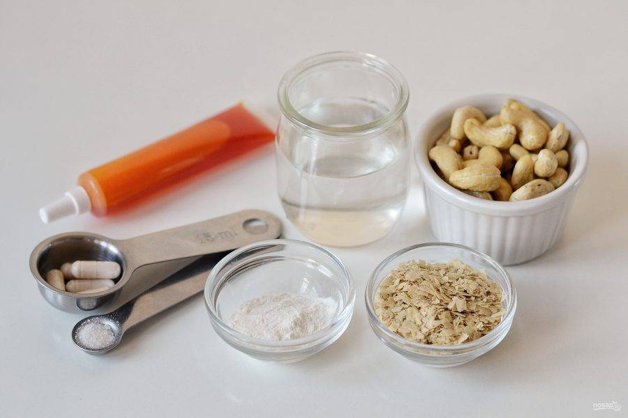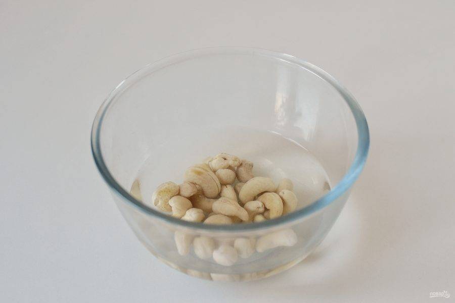 Кешью залейте горячей водой на полчаса. Затем слейте воду и промойте орехи.