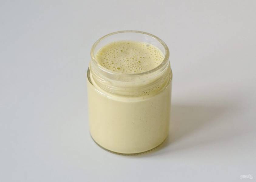 Перелейте получившуюся жидкость в баночку. Уберите в теплое место (не выше 40 градусов) на 9 часов. Можно использовать духовку, дегидратор или йогуртницу.