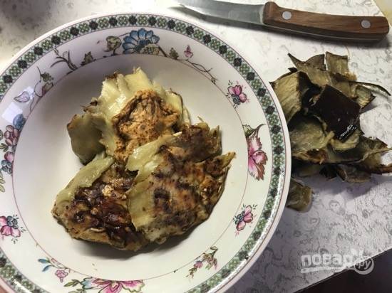 8. К этому моменту наши баклажаны уже должны запечься. Достаем их из духовки и очищаем от кожицы. Нарезаем.