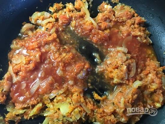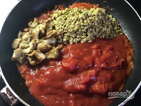 9. Добавляем в сковороду: баклажаны, томатную пасту, консервированные томаты и чечевицу. Солим по вкусу. Доводим до кипения, уменьшаем огонь и тушим под крышкой в течение одного часа.