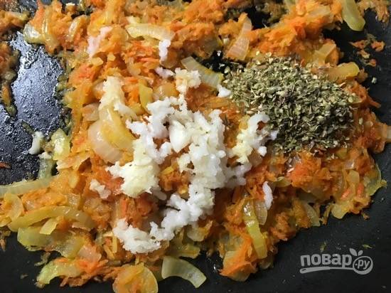 6. Когда овощи станут мягкими, добавьте чеснок и орегано. Обжарьте все пару минут.