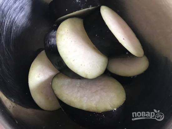 1. Первым делом порежьте баклажан кружочками и посыпьте солью. Оставьте на 10 минут.