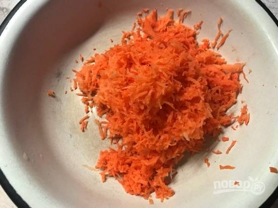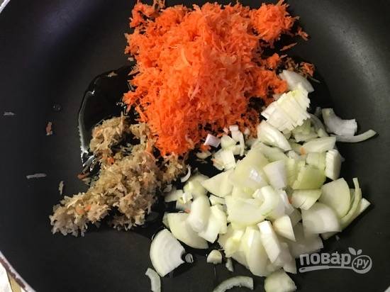 5. На разогретую с маслом сковороду выложите порезанный лук, морковь и натертый корень сельдерея. Обжарьте до мягкости.