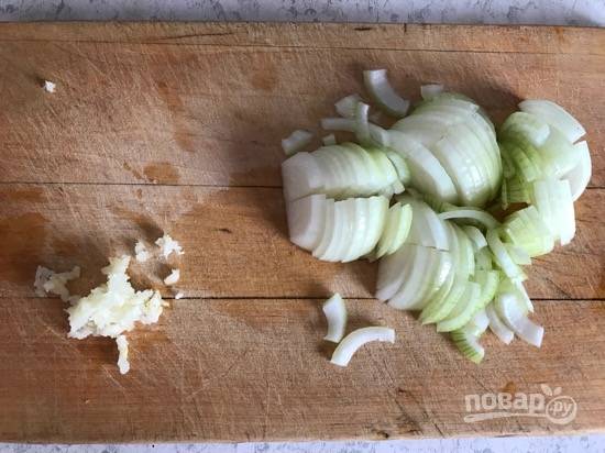 4. Чеснок и лук почистите. Лук нарежьте четвертькольцами, а чеснок выдавите через пресс.