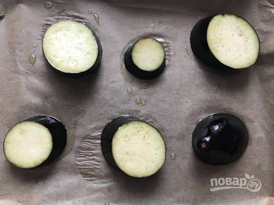 2. Через 10 минут промойте баклажаны, выложите их на противень, застеленный пергаментом, смажьте оливковым маслом. Поставьте в разогретую до 180 градусов духовку на 30-45 минут.