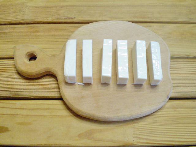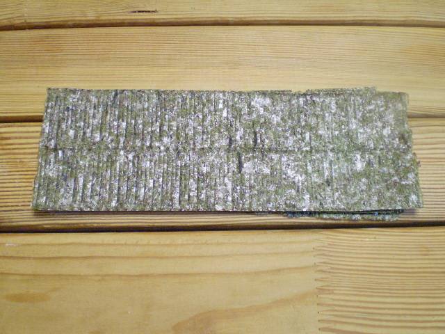 3. Листы нори ножницами режем на полоски по ширине чуточку больше сыра.