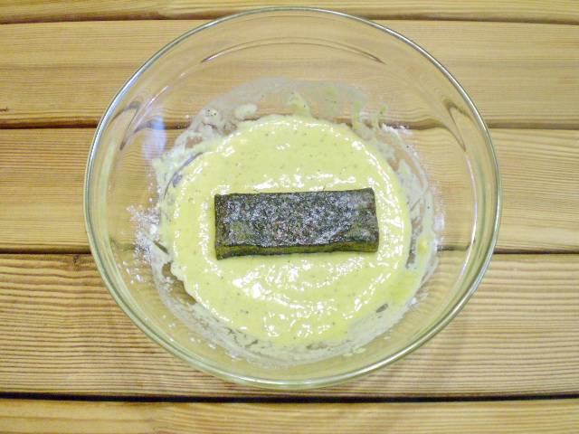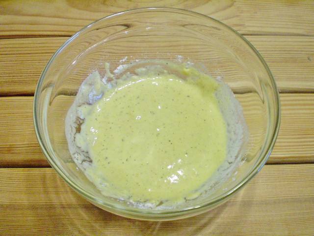 5. Добавляем воду. Кляр размешиваем вилочкой.