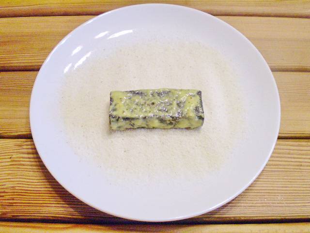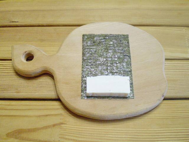 6. Кладем на влажный лист нори кусочек сыра, заворачиваем. Нори лучше приклеиваются когда чуть влажные, но не слишком мочите, чтобы не испортить водоросли.