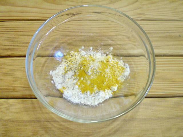 4. Готовим кляр. Муку соединяем с солью, куркумой, перцем молотым.